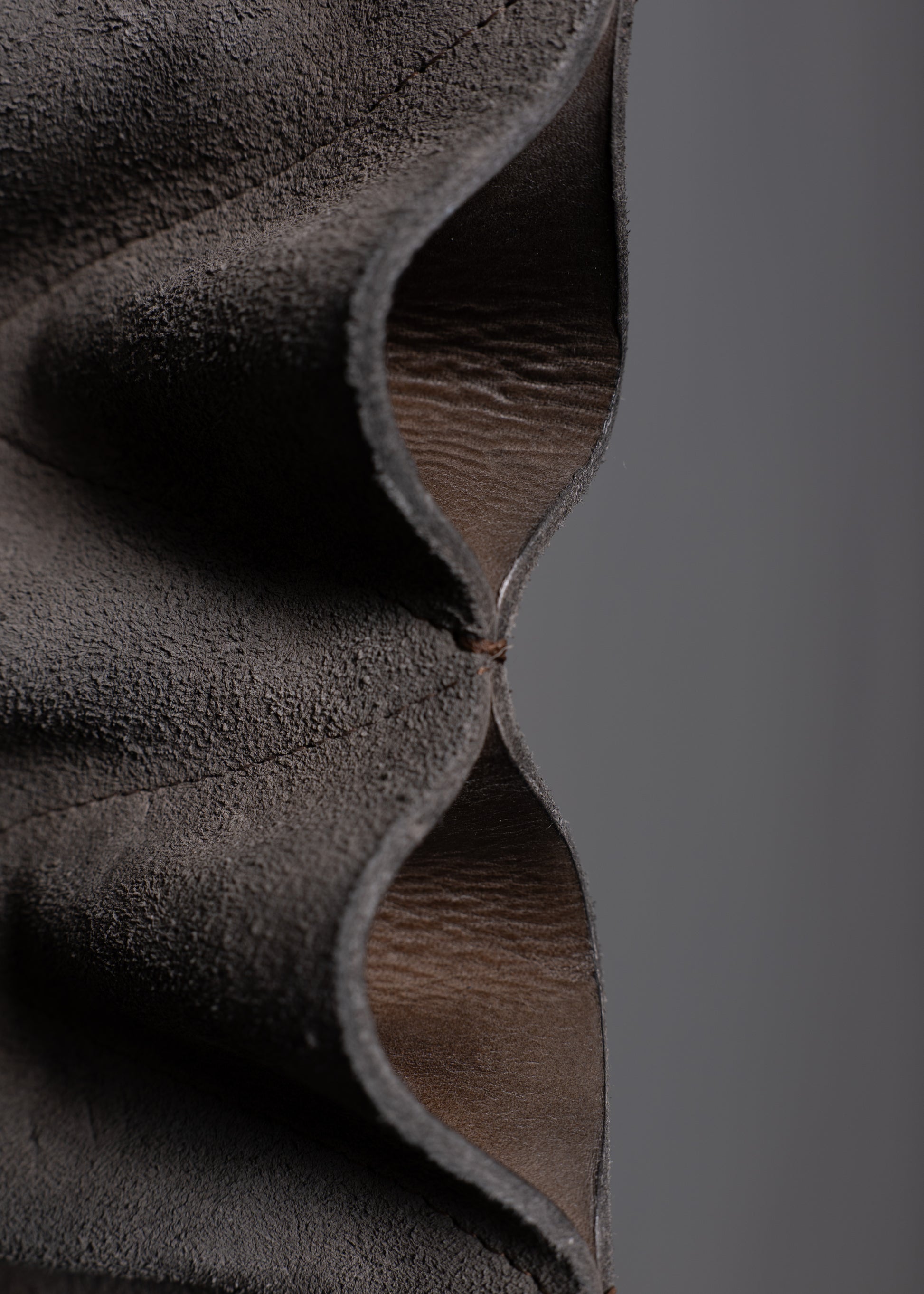The leather carries visible traces of process, time and interaction. Rather than being refined away, these variations are embraced, allowing the material to speak through its own transformation.