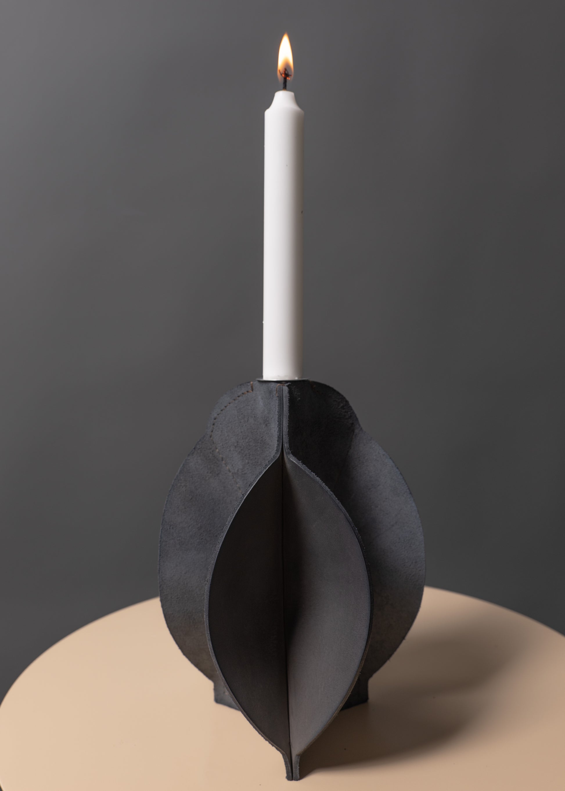 Crafted from naturally tanned leather, the candle holder is hand-modelled using techniques drawn from traditional shoemaking and leather bag craftsmanship. These methods allow the leather to be shaped, stretched and held under tension, resulting in a sculptural, organic form.