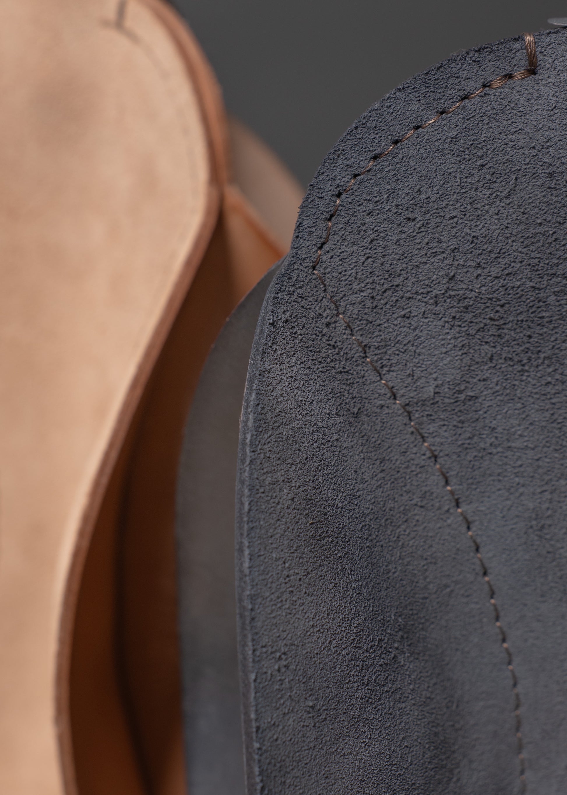 The grey colour emerges through a natural colouring process using metal-based reactions. Rather than being applied, the tone develops within the leather itself, creating subtle variations and depth. Selected areas are carefully polished with beeswax, adding a soft sheen and enhancing the material’s surface.