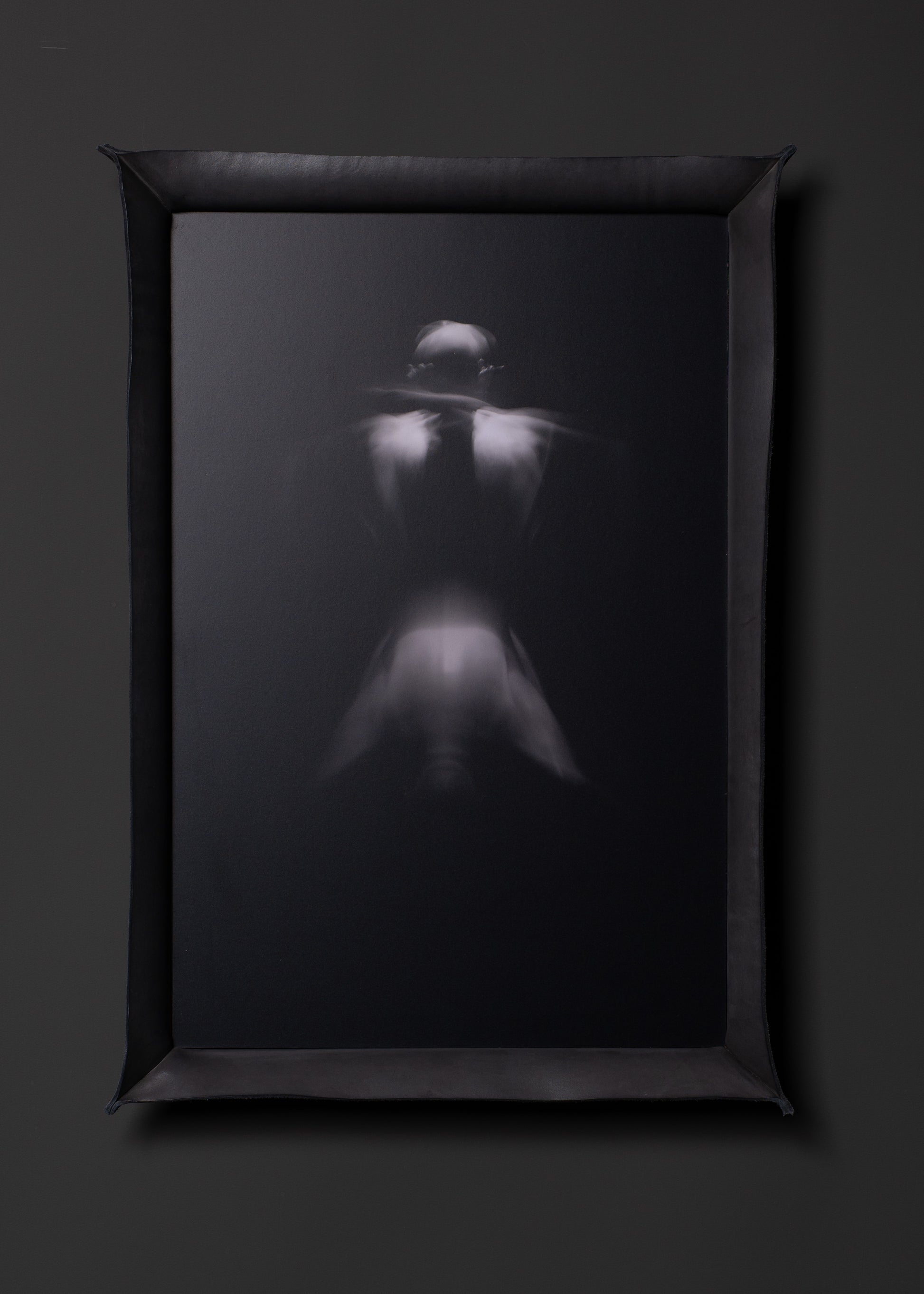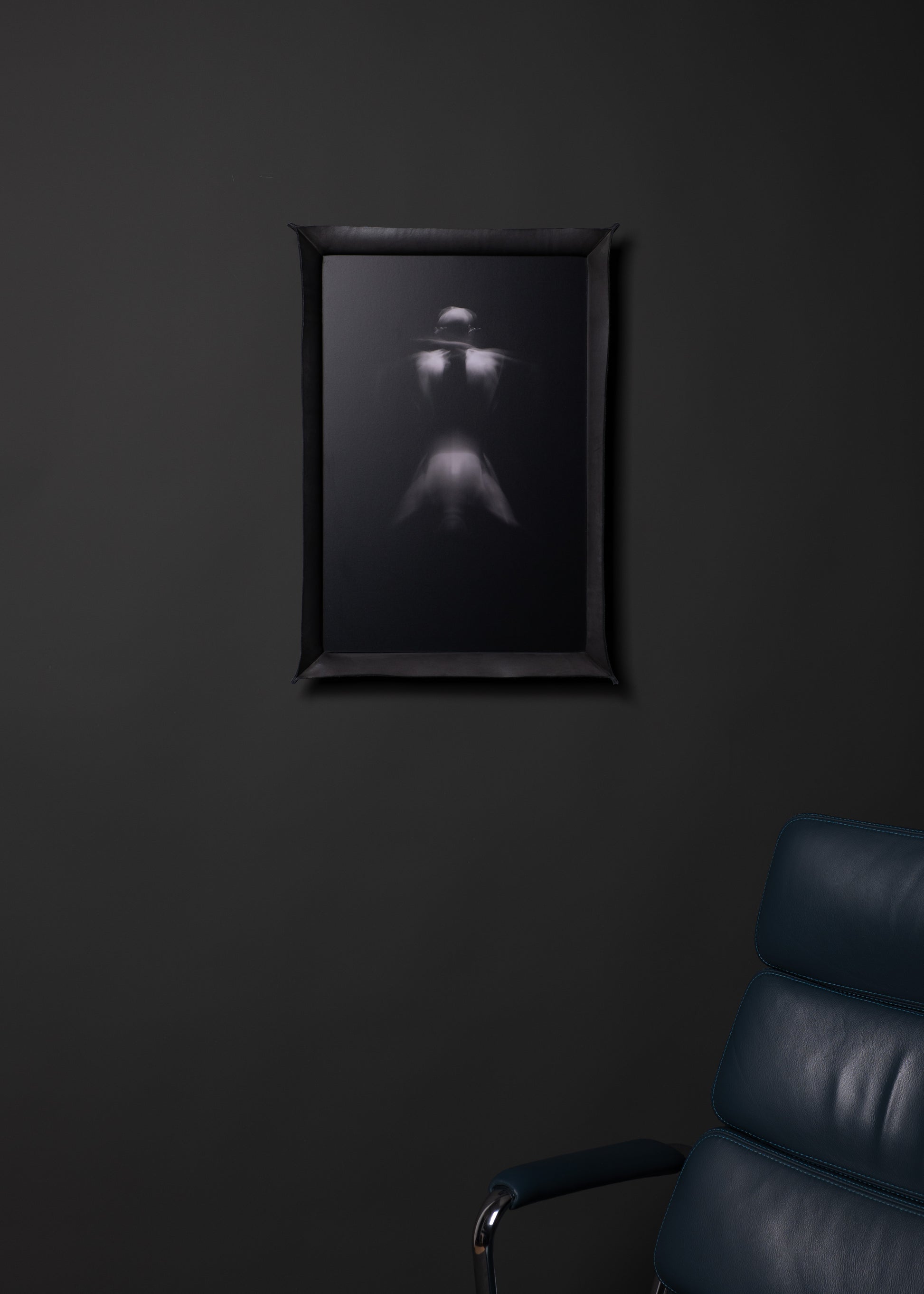 The photograph is printed on a rigid panel and framed in naturally tanned leather, hand-painted using a self-developed colouring technique. The leather frame is held under tension and intentionally irregular, continuing the physical language of the body — expanding, responsive, and alive.