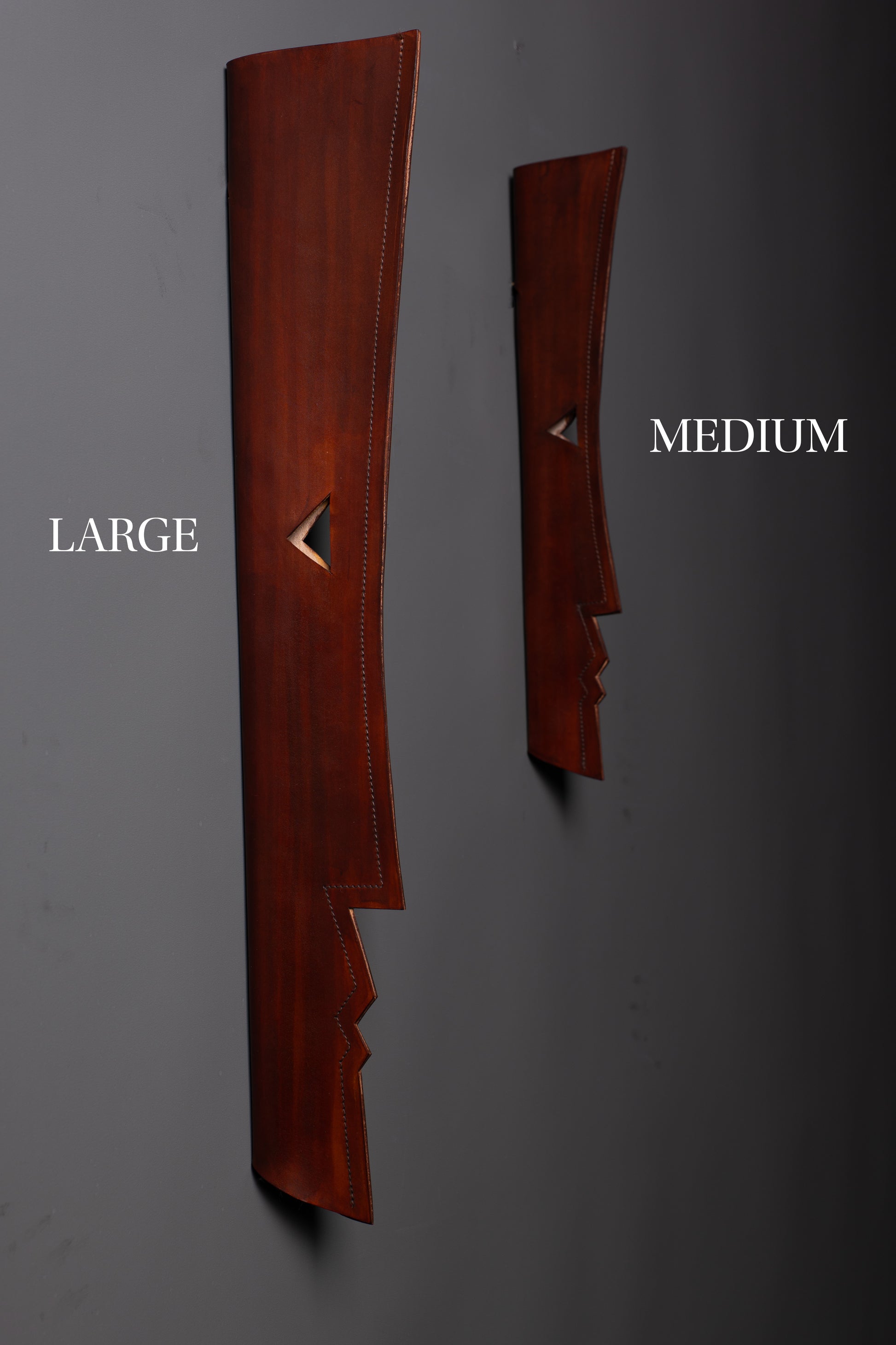 The mask is built up through multiple layers of hand-applied brown paint, creating depth and tonal richness. It is then carefully finished with beeswax, resulting in a deep, antique-like surface that enhances the leather’s natural character and patina.